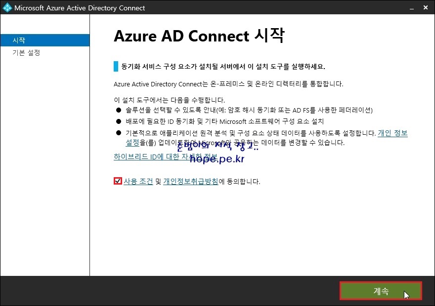 Microsoft Azure Active Directory Connect 창의 Azure AD Connect 시작 화면에서, '사용 조건 및 개인정보취급방침에 동의합니다.'에 체크후 '계속' 을 클릭 합니다.