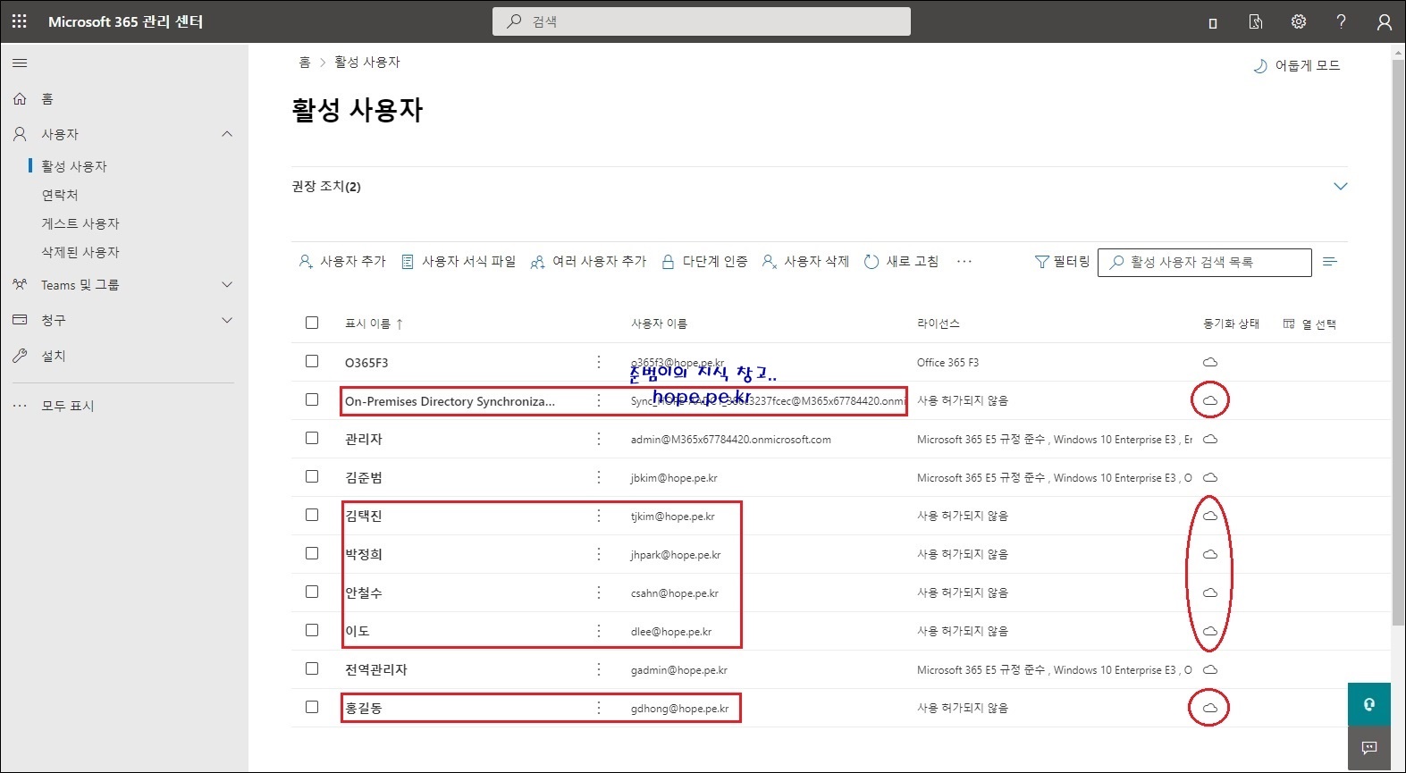 하지만 동기화 직후에는 동기화 되어 추가된 사용자들의 '동기화 상태' 열이 '클라우드에서' (구름 모양) 로 잘 못 표시가 됩니다.
