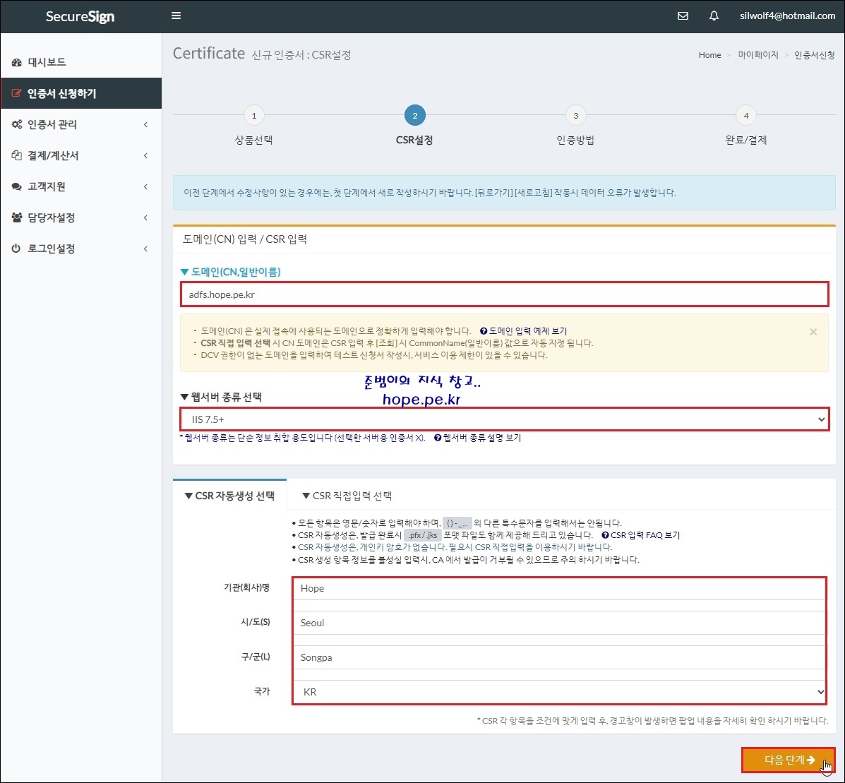 CSR설정 화면에서, 구매하고자 하는 '도메인 이름' 입력후, '웹서버 종류 선택' 선택후 'CSR 자동생성 선택'의 정보 입력후 '다음 단계' 를 클릭 합니다.