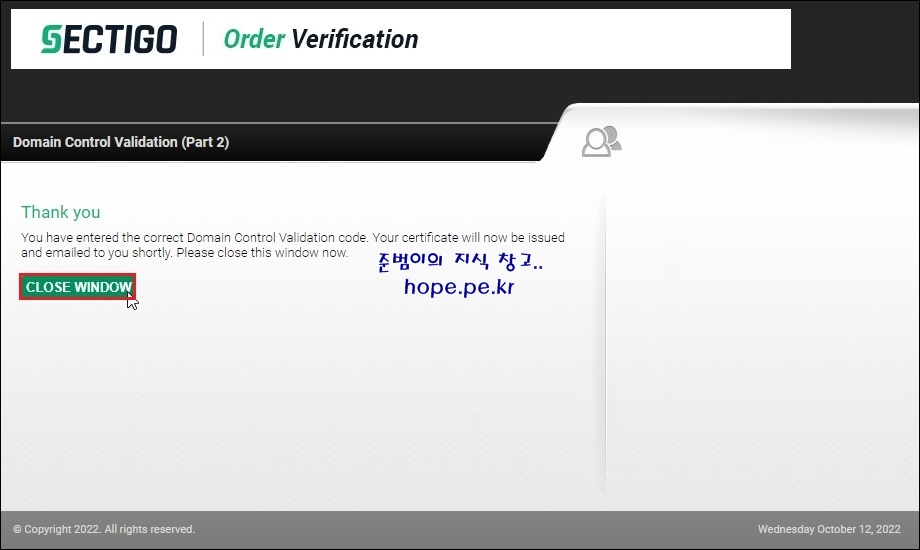확인이 완료되면, 'CLOSE WINDOW' 를 클릭 합니다.