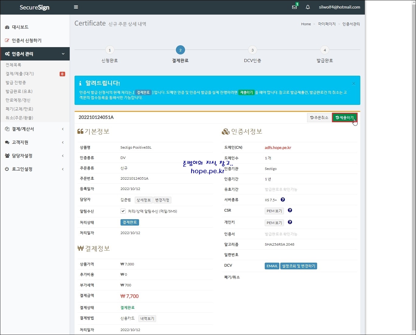 인증서 관리 페이지의 결제완료 화면에서, '제출하기' 를 클릭 합니다.