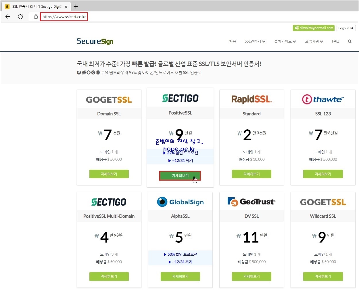 인증서 상품을 선택 합니다. 저는 22% 할인중인 상품인 'Sectigo PositiveSSL (22%할인)' 상품을 선택 했습니다.