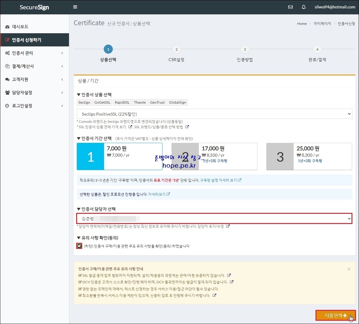 인증서 신청하기 페이지의 상품 선택 화면에서, '인증서 담당자 선택' 선택후 '유의 사항 확인(동의)'에 체크후 '다음 단계' 를 클릭 합니다.