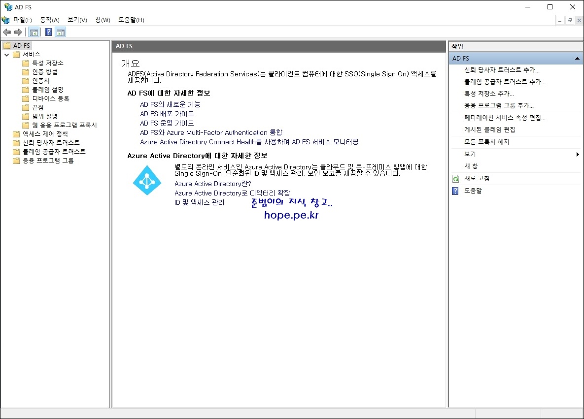 AD FS 관리 콘솔을 재 실행하면, 기본 역할이 전송되었기에 모든 관리자 기능이 표시 됩니다.