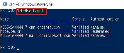 'Get-MsolDomain' 명령어를 실행하여 로그인 방식이 ADFS로 정상적으로 변경되었음을 확인 합니다.