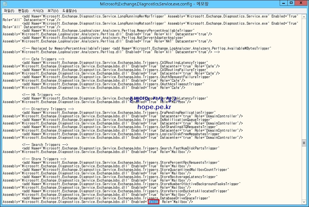 Exchange Server가 설치된 경로로 이동합니다. 그리고 'Microsoft.Exchange.Diagnostics.Service.exe.config' 파일에서 우클릭후 '편집' 을 클릭 합니다.