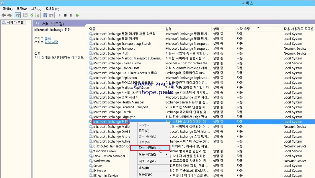 마지막으로, 서비스 콘솔 실행후, 'Microsoft Exchange 진단' 서비스에서 우클릭후 '다시 시작' 을 클릭하여 해당 서비스를 다시 시작하면 끝!
