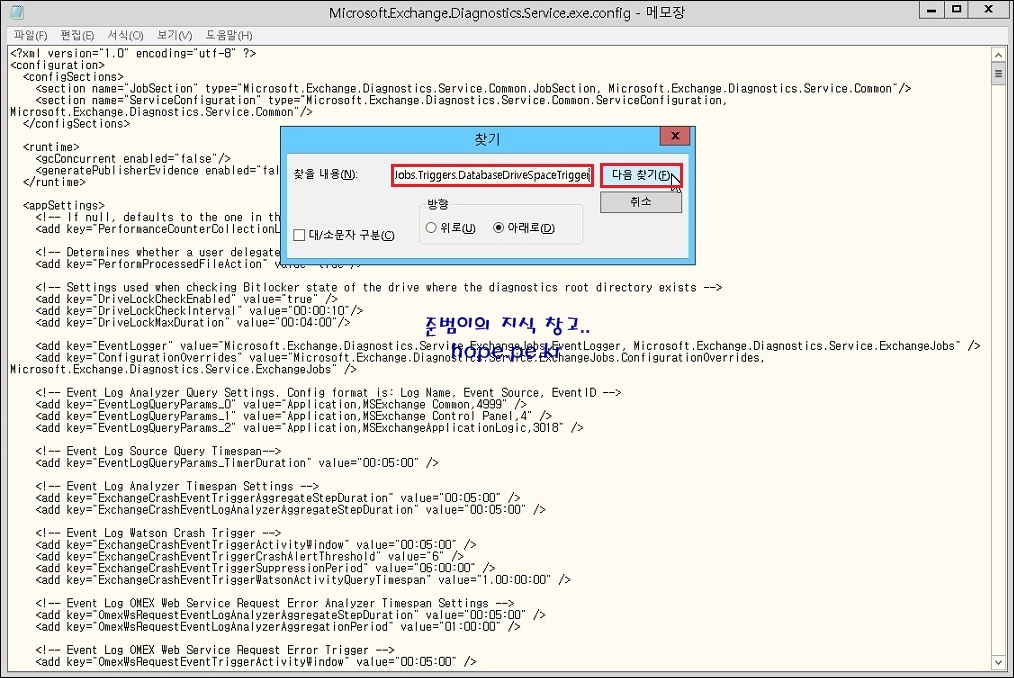 메모장에서 해당 파일이 열리면, 'Ctrl + F' 를 동시에 클릭해서 찾기 창을 실행 합니다. 그리고 'ExchangeJobs.Triggers.DatabaseDriveSpaceTrigger' 입력후 '다음 찾기' 를 클릭 합니다.