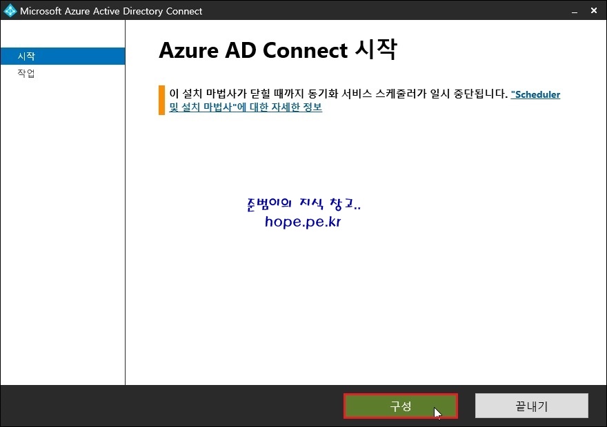 Microsoft Azure Active Directory Connect 창의 Azure AD Connect 시작 화면에서, ‘구성’을 클릭합니다.