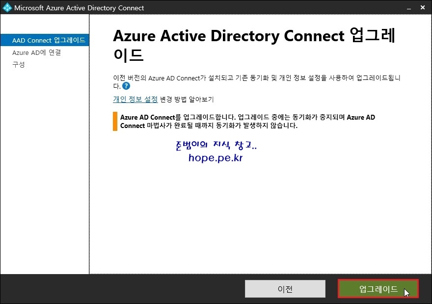 Cf) 화면의 경고 메시지와 같이 업그레이드 중에는 동기화가 중지되며 Azure AD Connect 마법사가 완료될 때까지 동기화가 진행되지 않습니다.