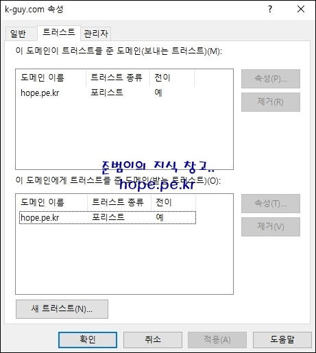 트러스트가 정상적으로 구성되면 '이 도메인이 트러스트를 준 도메인(보내는 트러스트)' 및 '이 도메인에게 트러스트를 준 도메인(받는 트러스트)' 에 트러스트 도메인이 등록되어 보여집니다.
