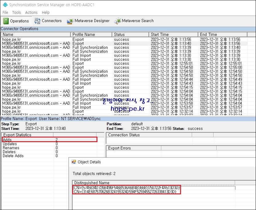 Synchronization Service Manager 에서 일정 시간 경과 후 동기화 설정을 한 사용자 개체들이 정상적으로 동기화 되었음을 확인할 수 있습니다.