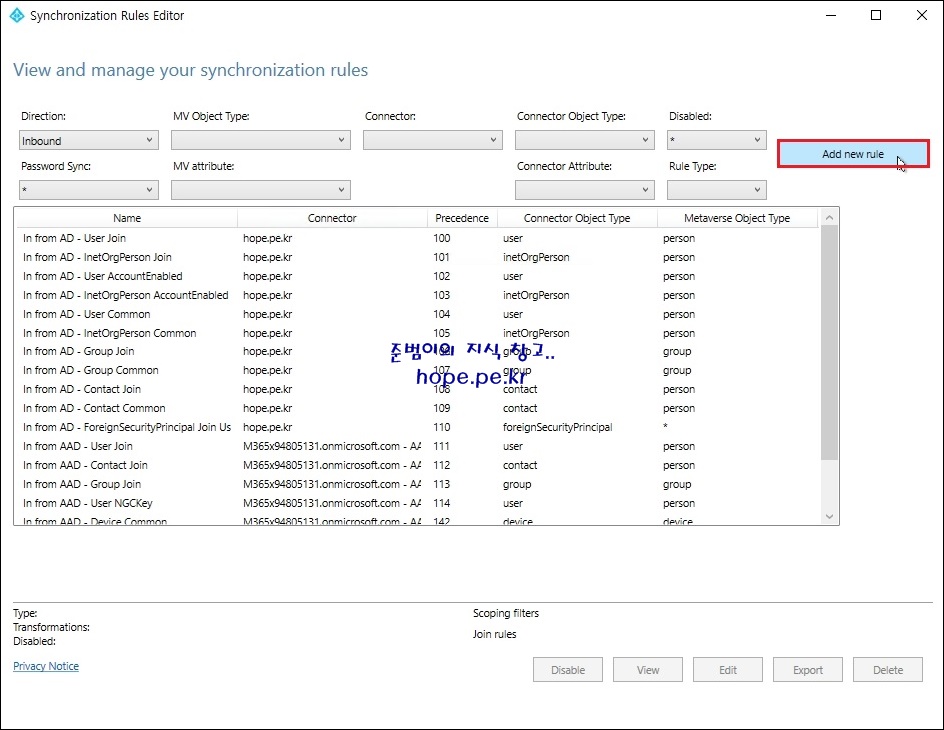 Synchronization Rules Editor 창에서, 'Add new rule' 을 클릭하여 특정 사용자만 동기화 하는 규칙을 생성 하겠습니다.