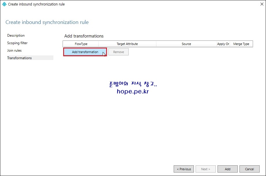 다음 스샷은 'hope.pe.kr' 도메인의 'Hope' OU 하위의 모든 개체들을 Microsoft Entra ID 와 동기화 하겠다는 의미 입니다.