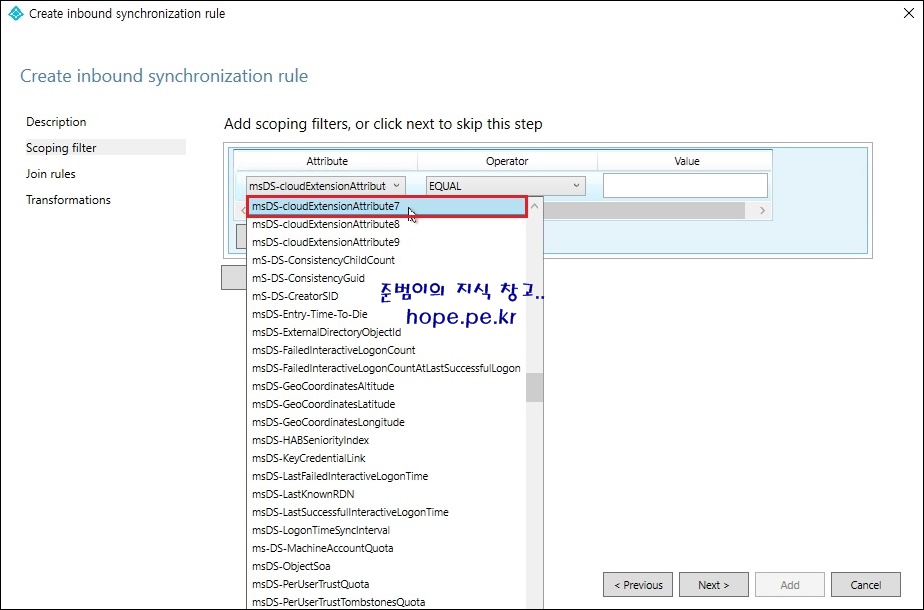 'Attribute' 에서 AD 서버에서 지정한 특성인 'msDS-cloudExtensionAttribute7' 특성을 클릭 합니다.