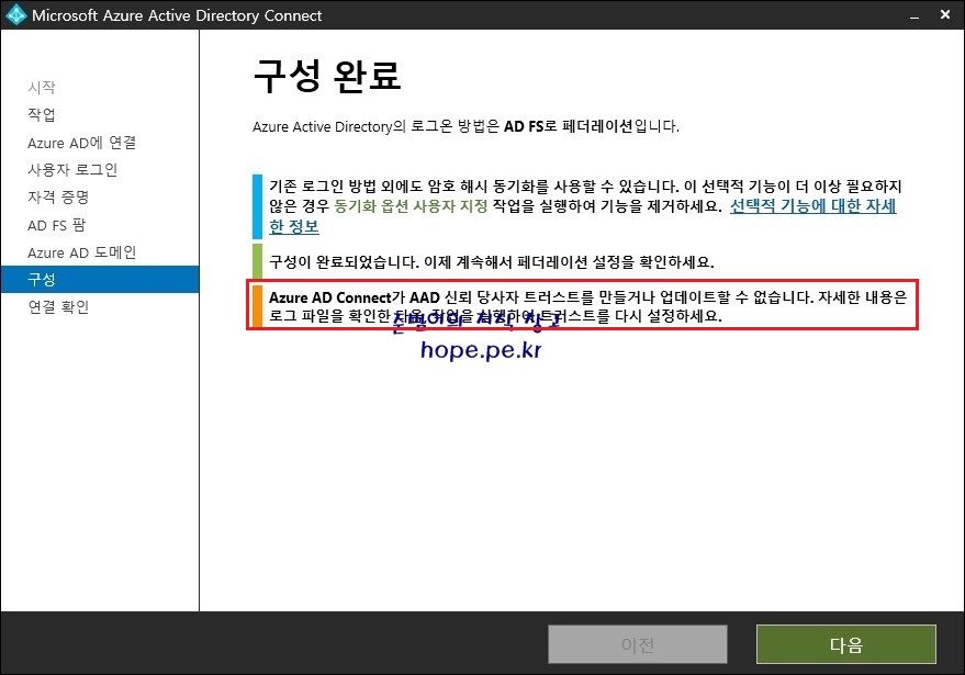 구성 완료 화면에서, 'Azure AD Connect가 AAD 신뢰 당사자 트러스트를 만들거나 업데이트 할 수 없습니다. 자세한 내용은 로그 파일을 확인한 다음 작업을 실행하여 트러스트를 다시 설정하세요. 경고 메세지가 발생하는 경우가 있습니다.