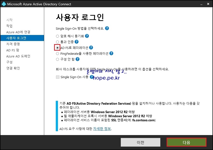 그리고 Azure AD Connect 설치 마법사를 실행하여 사용자 로그인 방법을 'AD FS 페더레이션' 으로 구성하는 과정을 다시 한번 진행 합니다.