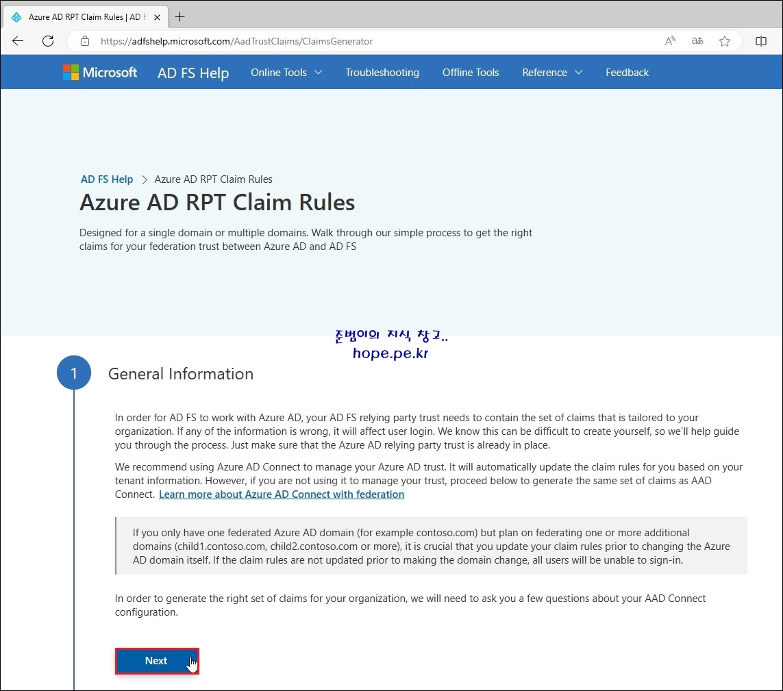 Azure AD RPT Claim Rules 화면에서, 1) General Information 단계의 'Next' 를 클릭 합니다.