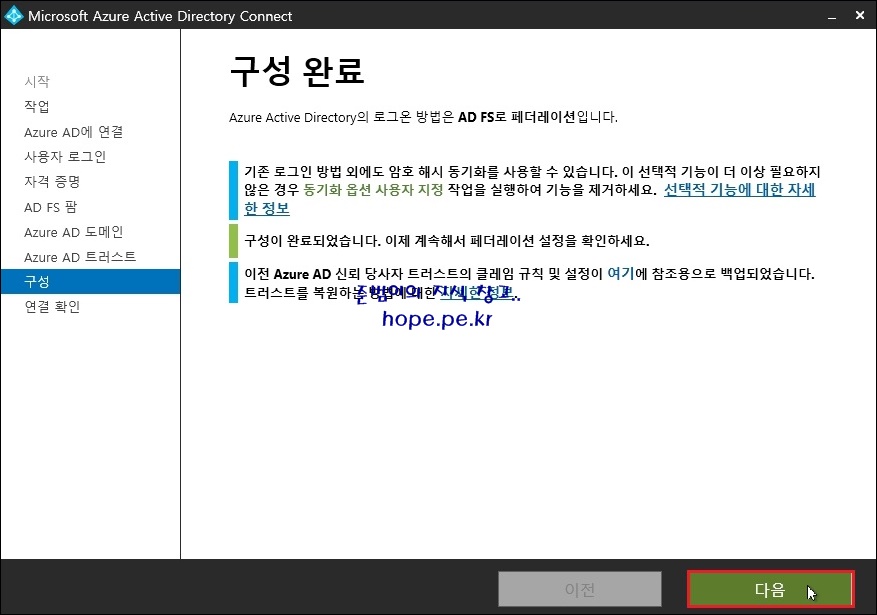 그러면 최초 과정시에는 표시되지 않았던 Azure AD 트러스트 과정이 표시됩니다. '다음' 을 클릭 합니다.