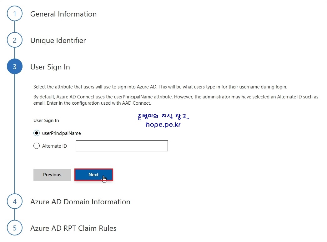3) User Sign in 단계에서, 조직에서 사용하는 User Sign In 방법 선택 후 'Next' 를 클릭 합니다.