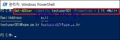 PowerShell을 관리자 권한으로 실행 후, 다음 cmdlet을 실행하여 특정 사용자의 EmailAddress 속성값이 존재함을 확인합니다.