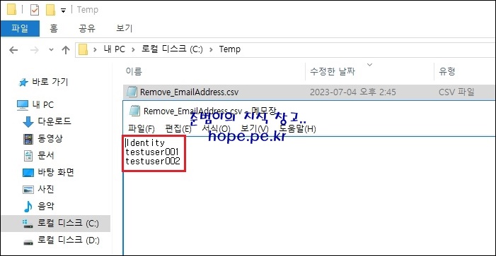다음 cmdlet을 실행하여, 해당 CSV 파일내 사용자들의 EmailAddress 속성값을 삭제 합니다.