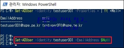 다음 cmdlet을 실행하여, 해당 사용자의 EmailAddress 속성값을 삭제 합니다.
