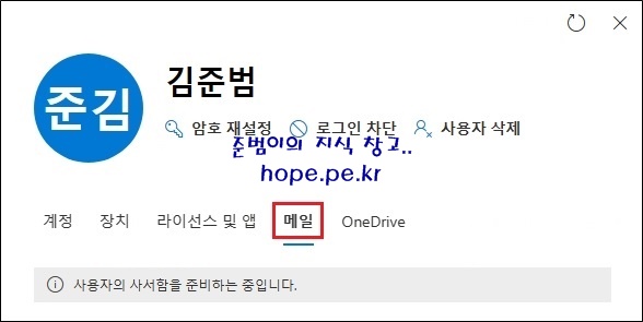 해당 사용자의 메일 메뉴를 클릭해보면, '사용자의 사서함을 준비하는 중입니다.'에서 변화가 없습니다.