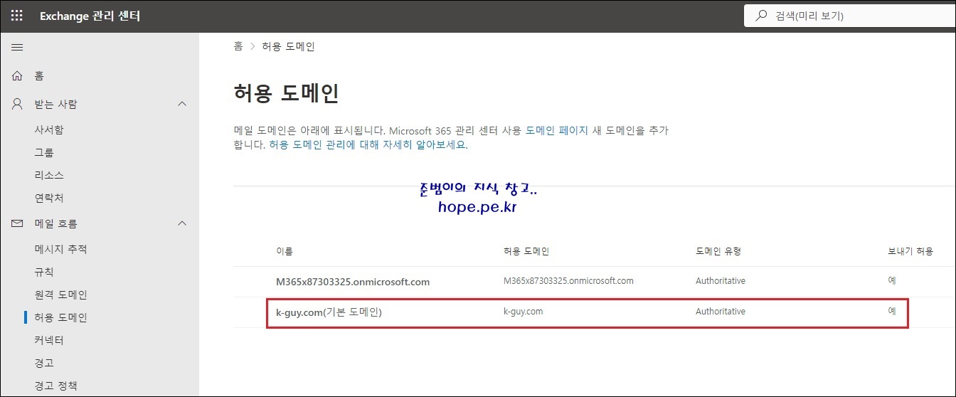 Exchange 관리 센터로 이동 후 '메을 흐름 > 허용 도메인' 메뉴에서 추가된 허용 도메인을 확인해봤습니다. Microsoft 365 관리 센터에서 추가했던 hope.pe.kr 도메인이 허용 도메인 목록에 추가가 안되어 있네요? 왓더?