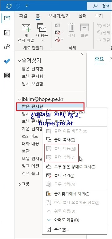 기본 폴더인 받은 편지함에서 우클릭을 해보면 다음과 같이 해당 폴더를 이동하거나 삭제를 할 수 없게끔 해당 메뉴가 비활성화 되어 있습니다.