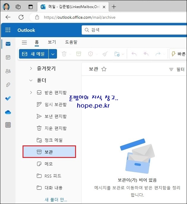 Exchange Online 사서함의 폴더 목록을 자세히 보면 On-Premise Exchange 사서함에는 없는 '보관' 폴더를 확인할 수 있습니다.