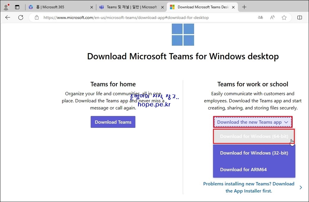 Download Microsoft Teams for Windows desktop 페이지에서, 'Download the new Teams app' 클릭 후 '원하는 New Teams 버전' 을 클릭 합니다.
