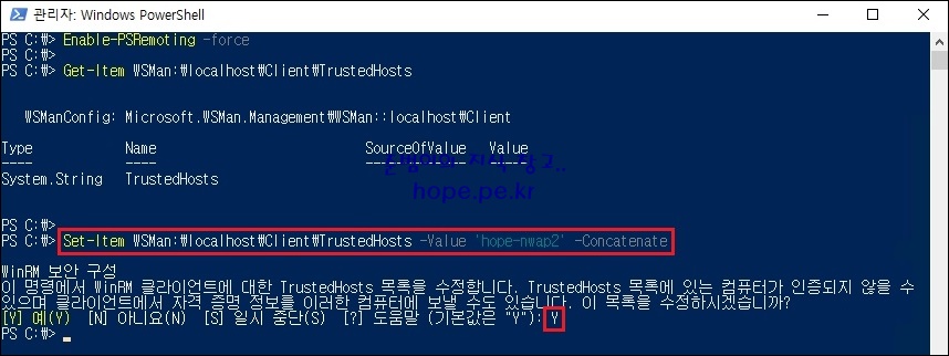 다음 cmdlet 명령어를 실행하여 TrustedHosts 목록을 확인 합니다.