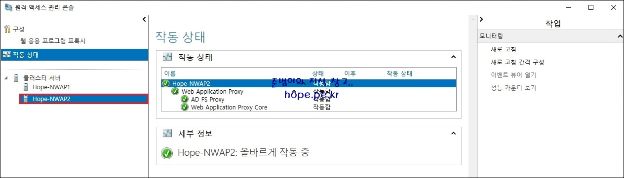 이제 원격 액세스 관리 콘솔을 닫았다가 재실행 후 '작동 상태' 를 확인해보면, 다음과 같이 다른 클러스터 서버의 상태가 '작동함'으로 정상적으로 표시 됩니다.
