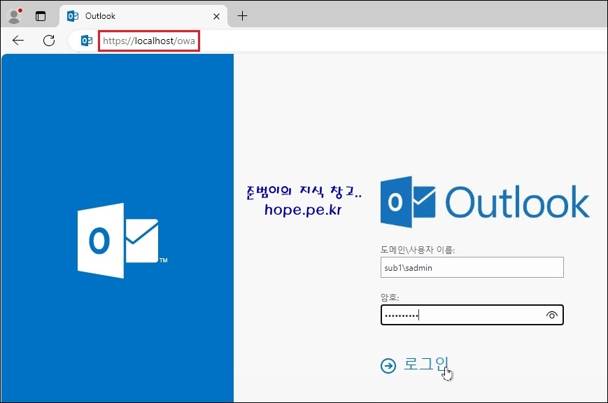 OWA 페이지 (https://localhost/owa) 에 접속 후 로그인을 진행 합니다.