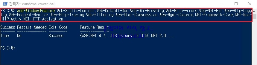 Windows PowerSehll을 관리자 권한으로 실행 후, 다음 명령을 실행하여 .NET Framework 및 Tracing을 포함하여 IIS 역할을 설치 합니다.