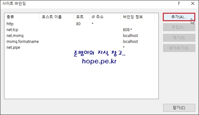 사이트 바인딩 창에서, '추가' 를 클릭 합니다.