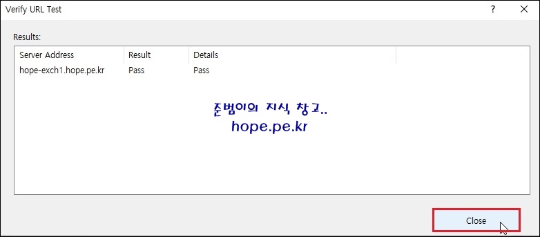 URL 테스트 결과가 'Pass' 임을 확인 후 'Close' 을 클릭 합니다.