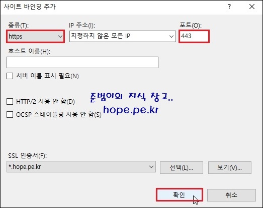 사이트 바인딩 추가 창에서, 종류를 'https' 선택 후 포트에 '443' 입력 후 '확인' 을 클릭 합니다.