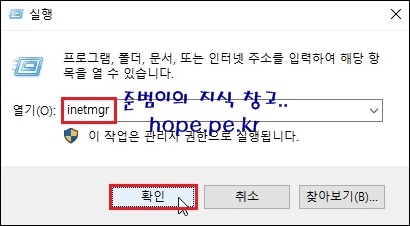 실행 창 (Windows Key + R Key) 에서, 'inetmgr' 입력 후 '확인' 을 클릭 합니다.