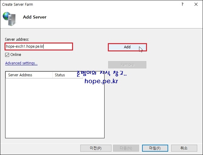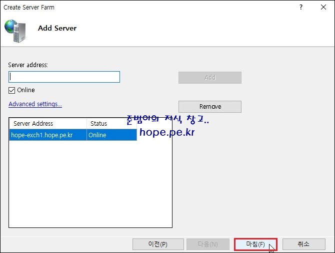 Exchange Server 추가 되었음을 확인 후 '마침' 을 클릭 합니다.