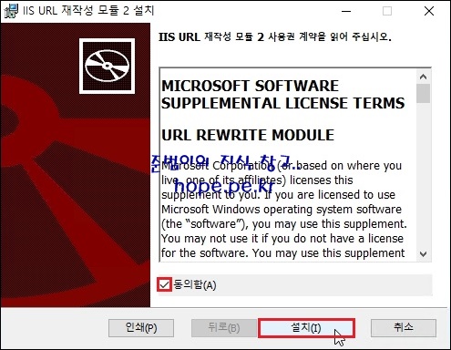 IIS URL 재작성 모듈 2 설치 창에서, '설치' 를 클릭 합니다.
