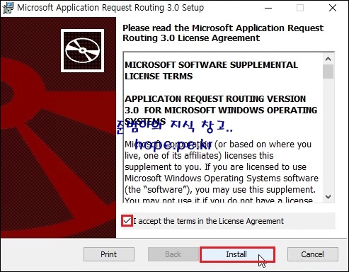 Microsoft Application Request Routing 3.0 Setup 창에서, 'I accept the terms in the License Agreement' 에 체크 후 'Install' 을 클릭 합니다.