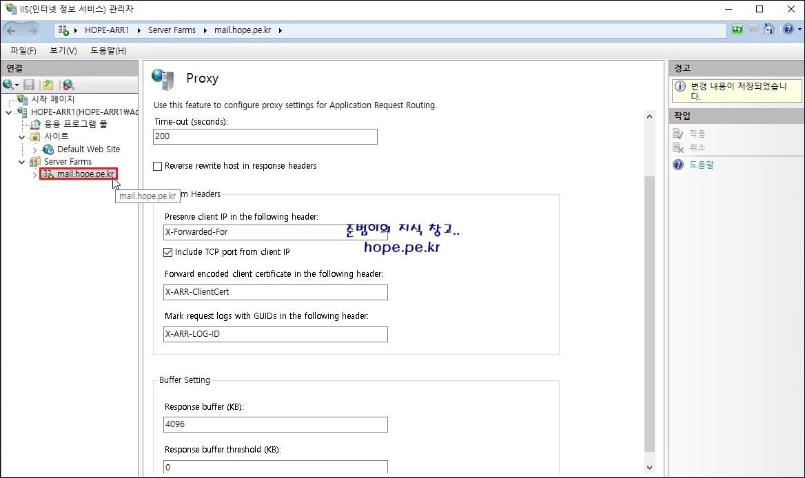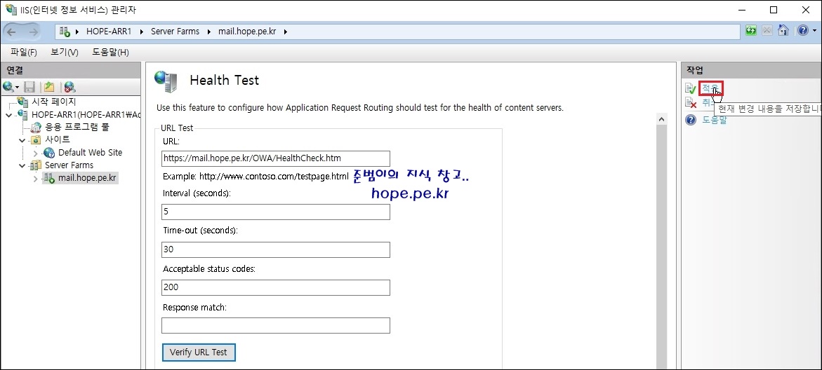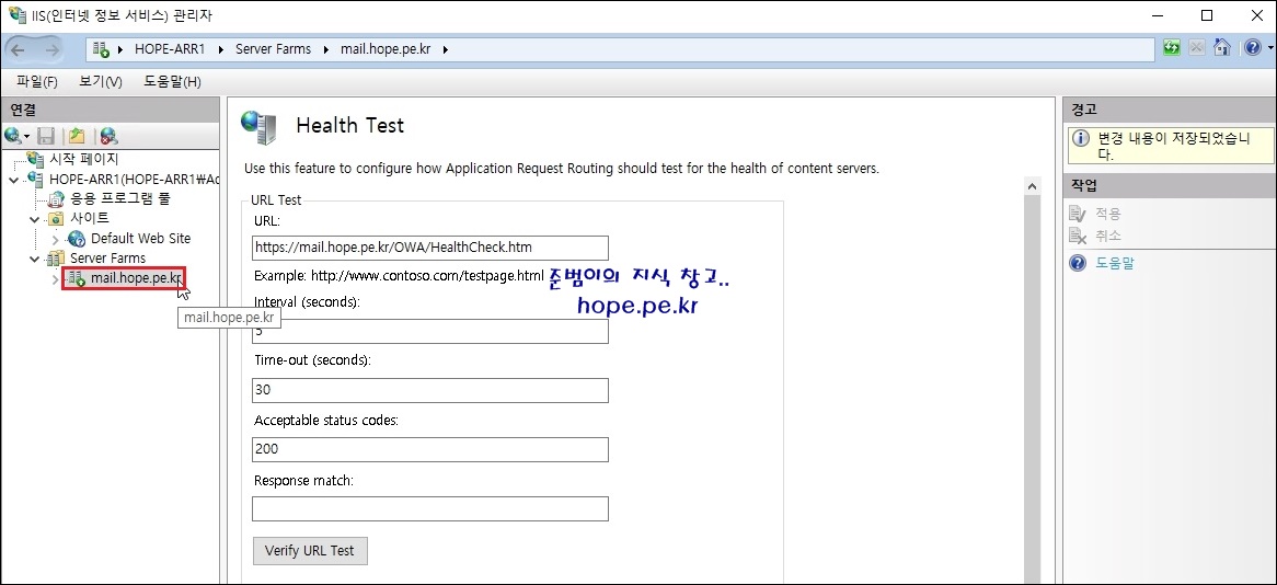 자~ 이제, IIS ARR을 이용하여 Exchagne Server 2016 환경을 위한 부하 분산 기능이 있는 역방향 프록시 서버의 구성 과정이 모두 완료 되었습니다!