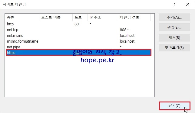 https 바인딩이 추가됨을 확인 후, '닫기' 를 클릭 합니다.