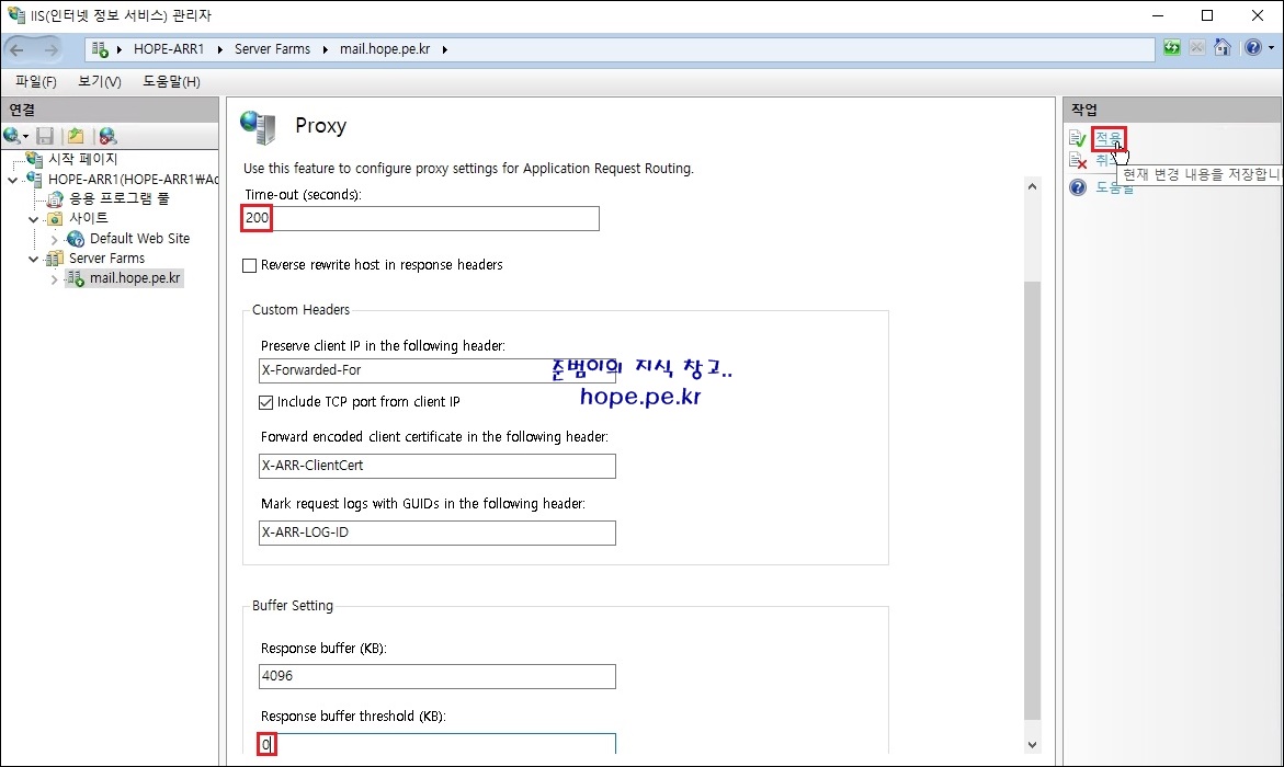 Proxy 화면에서, Time-Out 에 '200' 입력 후 Response buffer threshlod 에 '0' 입력 후 우측 작업 패널에서 '적용' 을 클릭 합니다.