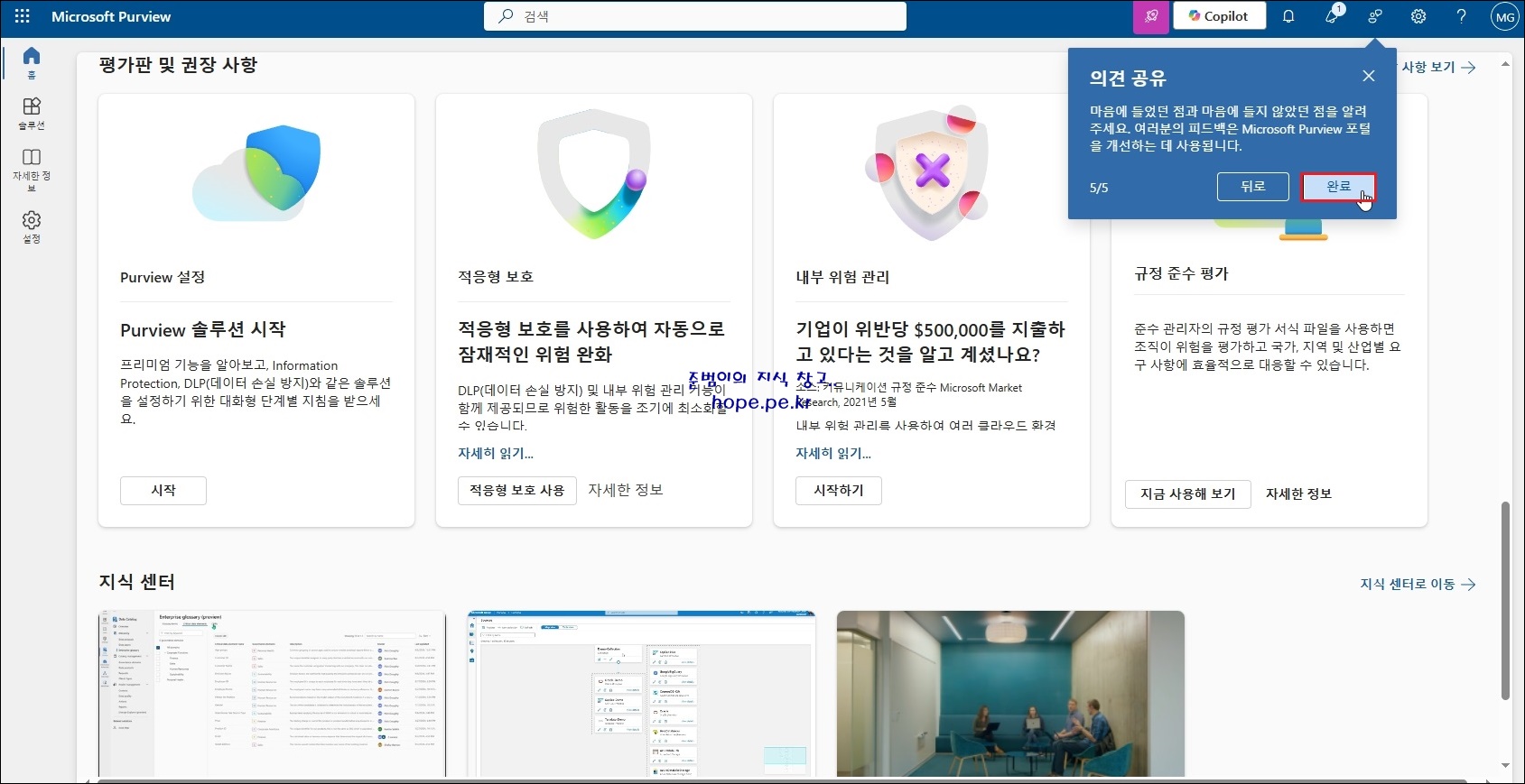 '의견 공유 - 마음에 들었던 점과 마음에 들지 않았던 점을 알려주세요. 여러분의 피드백은 Microsoft Purview 포털을 개선하는 데 사용됩니다.'