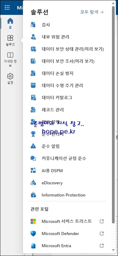 그럼 Microsoft Purview 포털에서 사용할 수 있는 모든 메뉴들을 확인할 수 있습니다.