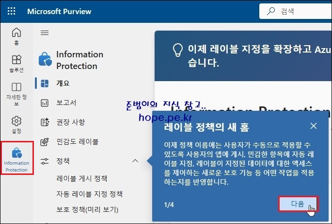 Cf) Information Protection 에 처음 접속 시 주요 기능에 세부 메세지가 표시 됩니다.'정책' 의 세부 메세지 확인 후 '다음' 을 클릭 합니다.