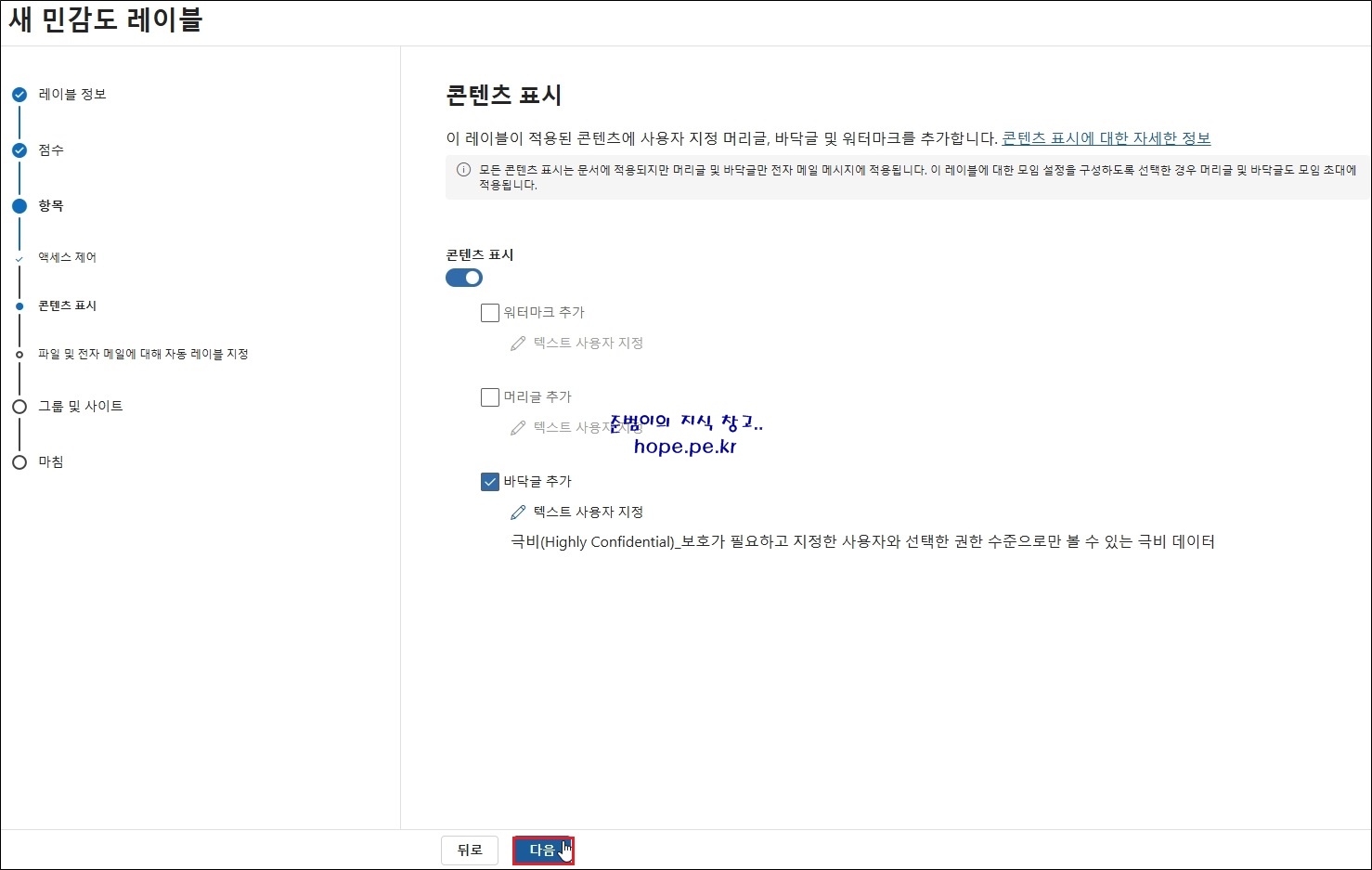 (본 포스팅에서는 바닥글 텍스트는 '극비(Highly Confidential)_보호가 필요하고 지정한 사용자와 선택한 권한 수준으로만 볼 수 있는 극비 데이터' 로 입력 하였고, 나머지는 기본값을 사용 하였습니다.)